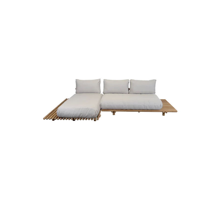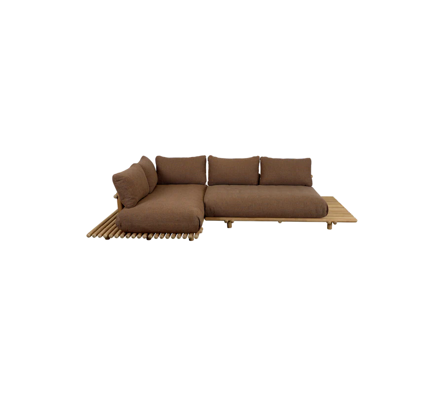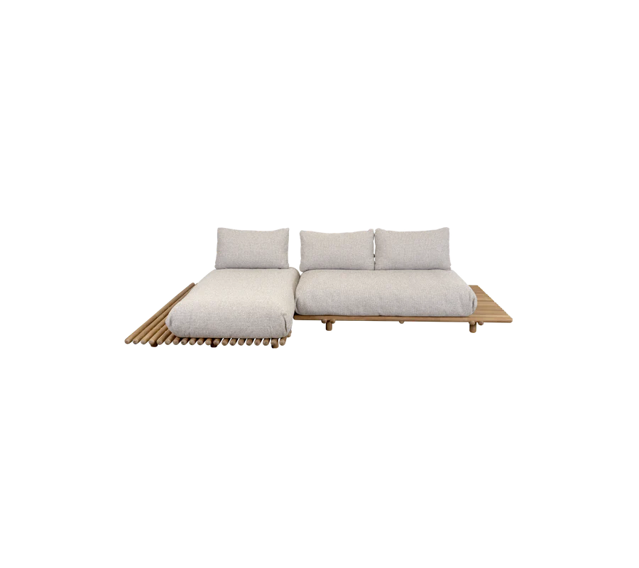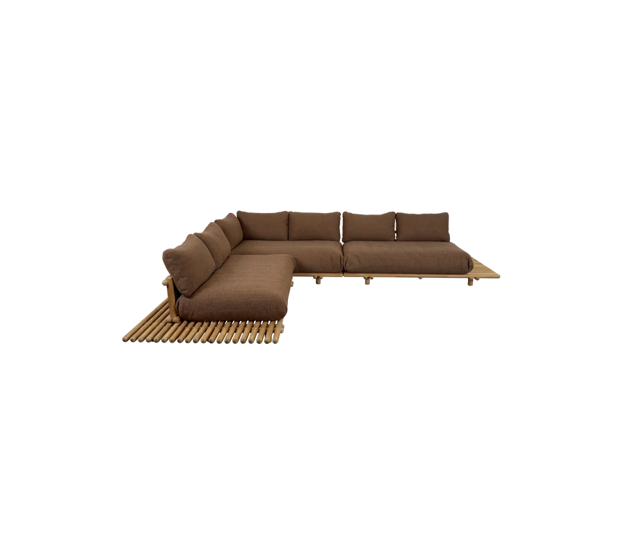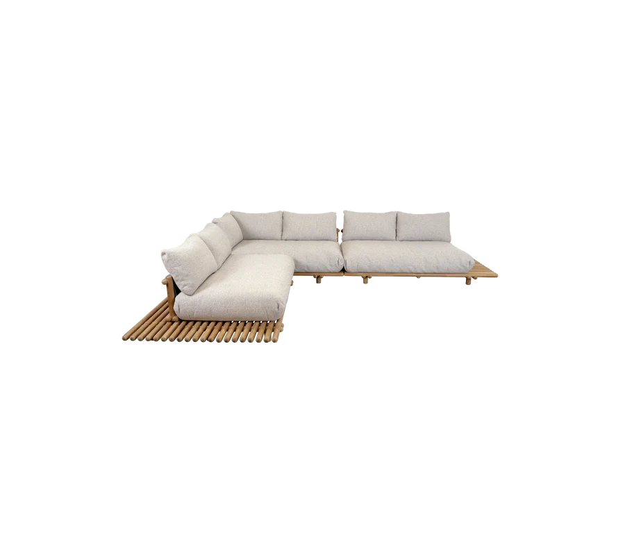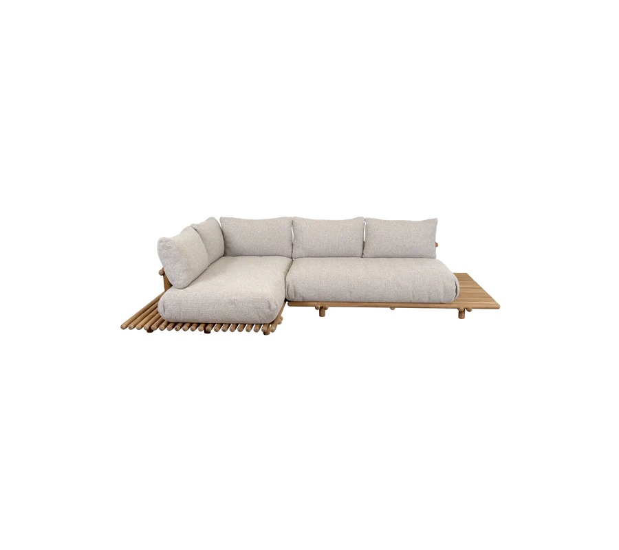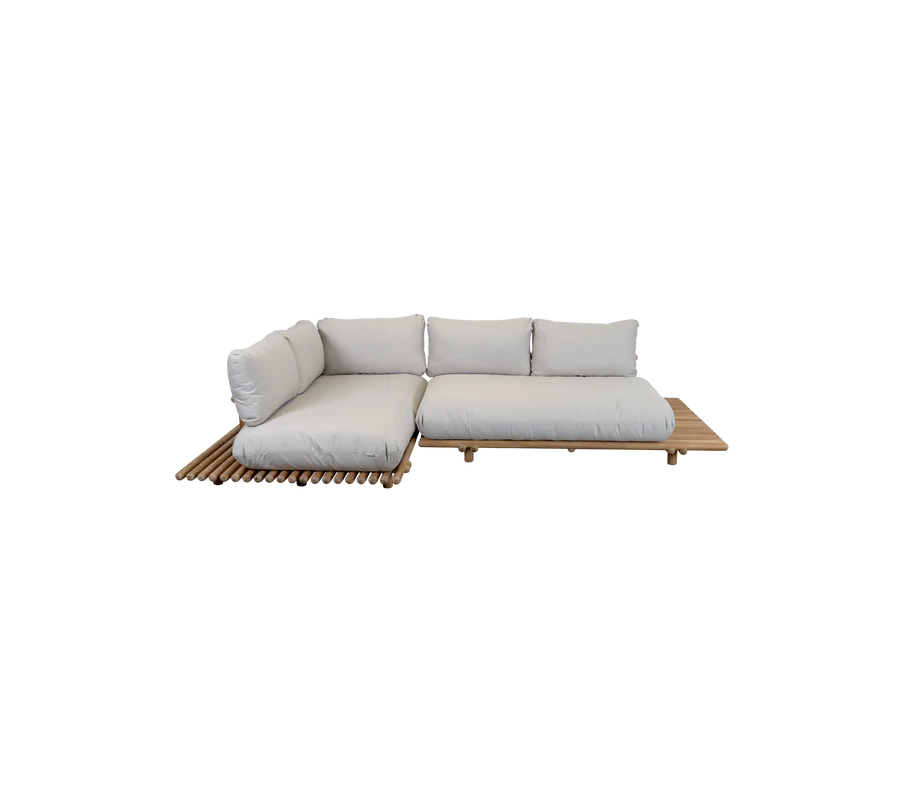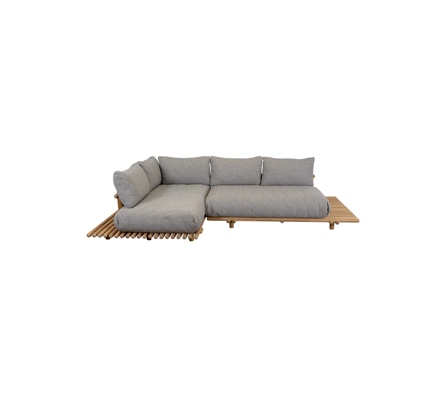 The Sticks Platform corner sofa, designed by Cane-line Design, blends casual comfort and sophisticated design, making it perfect for solo lounging or social gatherings. Its durable frame comes in certified teak, which gains a beautiful silver-grey patina over time. If you wish to preserve the original golden-brown colour, we recommend using Teak Care products. The frame is also available in powder-coated aluminium with strong durability and low maintenance. The plush seating and back cushions are made with resilient fabric and feature the innovative QuickDry & Airflow system, providing quick-drying and optimal air circulation all year round, even after rain.