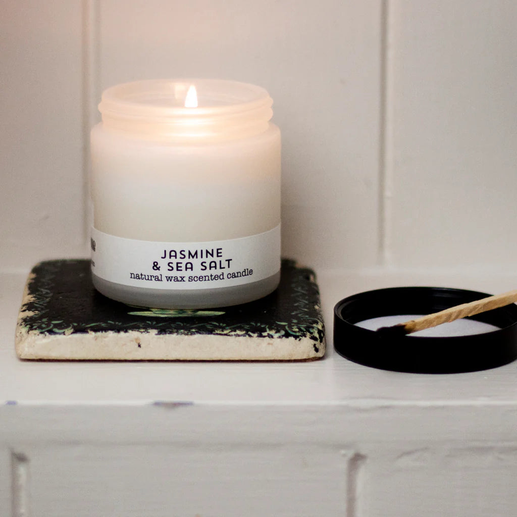 Icy white sprayed glass, with a semi opaque finish; candles hand-poured in England using a vegan wax blend of soy and rapeseed, scented with high quality perfume oils and blends of essential and botanical oils, which when used with a cotton wick give a very clean burn and an amazing scent throw, each candle will burn for up to 25 hours.